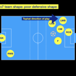 Here’s an example of center backs disappearing. They forgot that the first word in “center back” is “center,” while the second word in “center back” is “back.” Another no-no: our right wing back is daydreaming. And our goalie is way too close to her own goal.