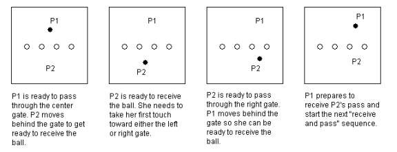 - Setup an area with four markers or cones in the center, 1 yard apart. The gaps between the markers serve as passing “gates”. Players start on opposite sides of the markers. Player P1 passes through a gate to player P2. P2 is required to pass the ball back through a different gate. P2 gets up to three touches to make the return pass. The sequence continues, with P1 passing back through a different gate than P2’s pass. The diagram above shows a progression through four moments of the game.